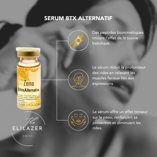 Le sérum Btx Alternative est spécifiquement formulé pour lutter efficacement contre le vieillissement cutané. Il aide à réduire la profondeur des rides et apporte un effet tenseur ciblé à l'épiderme. La peau est plus souple, l'épiderme est protégé, et les rides sont réduites.